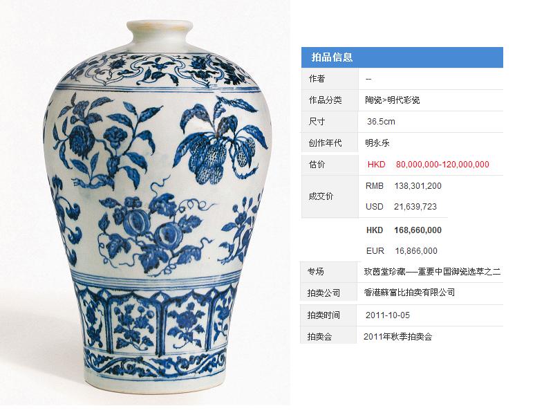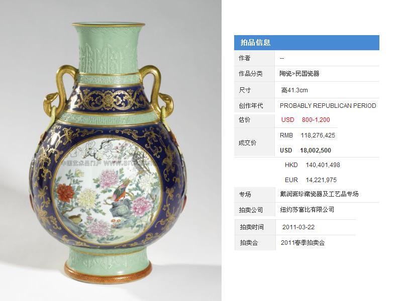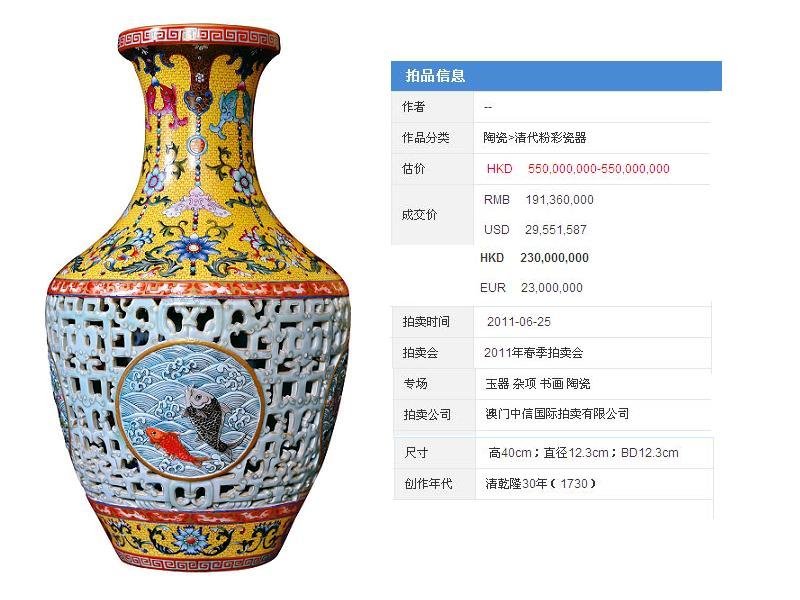 清:乾隆粉彩镂空“吉庆有余”转 【导读】清乾隆年代官窑花瓶,体态匀称,色泽饱满典雅,瓶身鲤鱼图案栩栩如生,配以镂空水波纹雕花设计,显得大气富贵,恰到好处地映衬了瓶颈上的红色“吉”字中所蕴含的吉祥之意。该拍品内绘青花,外画洋彩、珐琅彩、粉彩,运用描金,镂空、转心、浮雕、浅刻等多种工艺,极尽奢华、叹为观止,属于清三代瓷器中的巅峰之作。…… 宋:北宋官窑深腹碗【导读】北宋官窑传世极少,十分珍稀名贵。现除上海博物馆有四片瓷片, 台湾鸿禧美术馆有一片瓷片, 中国文物考古部门在北宋官窑的窑址曾发掘出土几件残器和瓷片外, 全世界迄今没有一件完整器。由于北宋官窑是从汝官窑进化而来,故更显珍贵,文物价值、历史价值、收藏价值等远远超过汝窑。说明:深腹碗 敞口,斜壁,直圈足,底面上有 4 个圆形支钉痕。通体淡青釉略泛绿。玻璃质感较强,器表开片纹密集。……