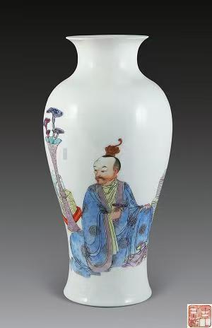 “居仁堂”款粉彩人物观音瓶 【导读】此瓶口沿外撇,短束颈,溜肩,腹下渐敛至底渐外撇,浅足。胎质洁白,釉色莹润。外壁绘粉彩博古高士图,高士宽袖博衣,席地而坐,灵芝、花觚、古书等博古之物陈列左右,一派仙风道骨。足书红彩“居仁堂制”篆书款...〔详细点击文章标题或图片〕